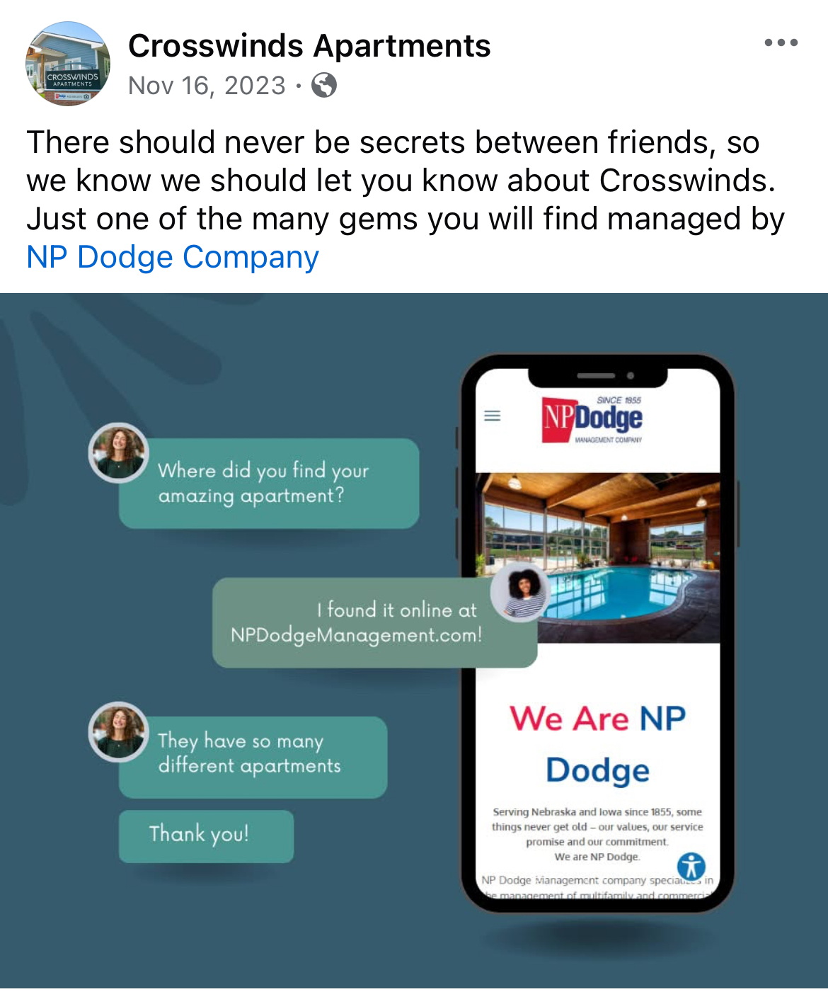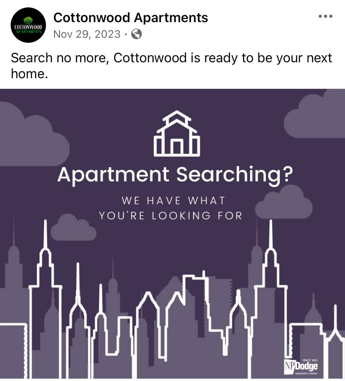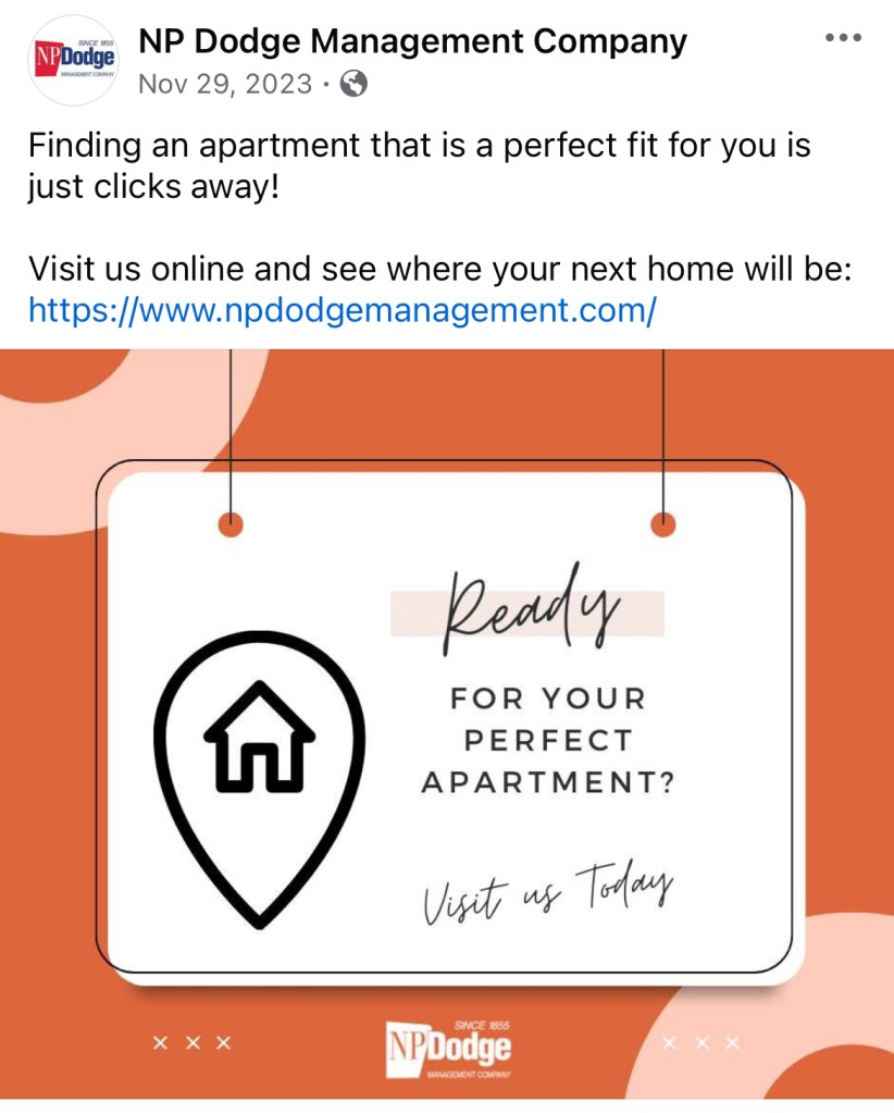For two years I was the Social Media and Reputation Management Liaison for NP Dodge Property Management. This page has examples of work I did pulled from the Facebook pages of NP Dodge Property Management and some select apartment complexes managed by them also.