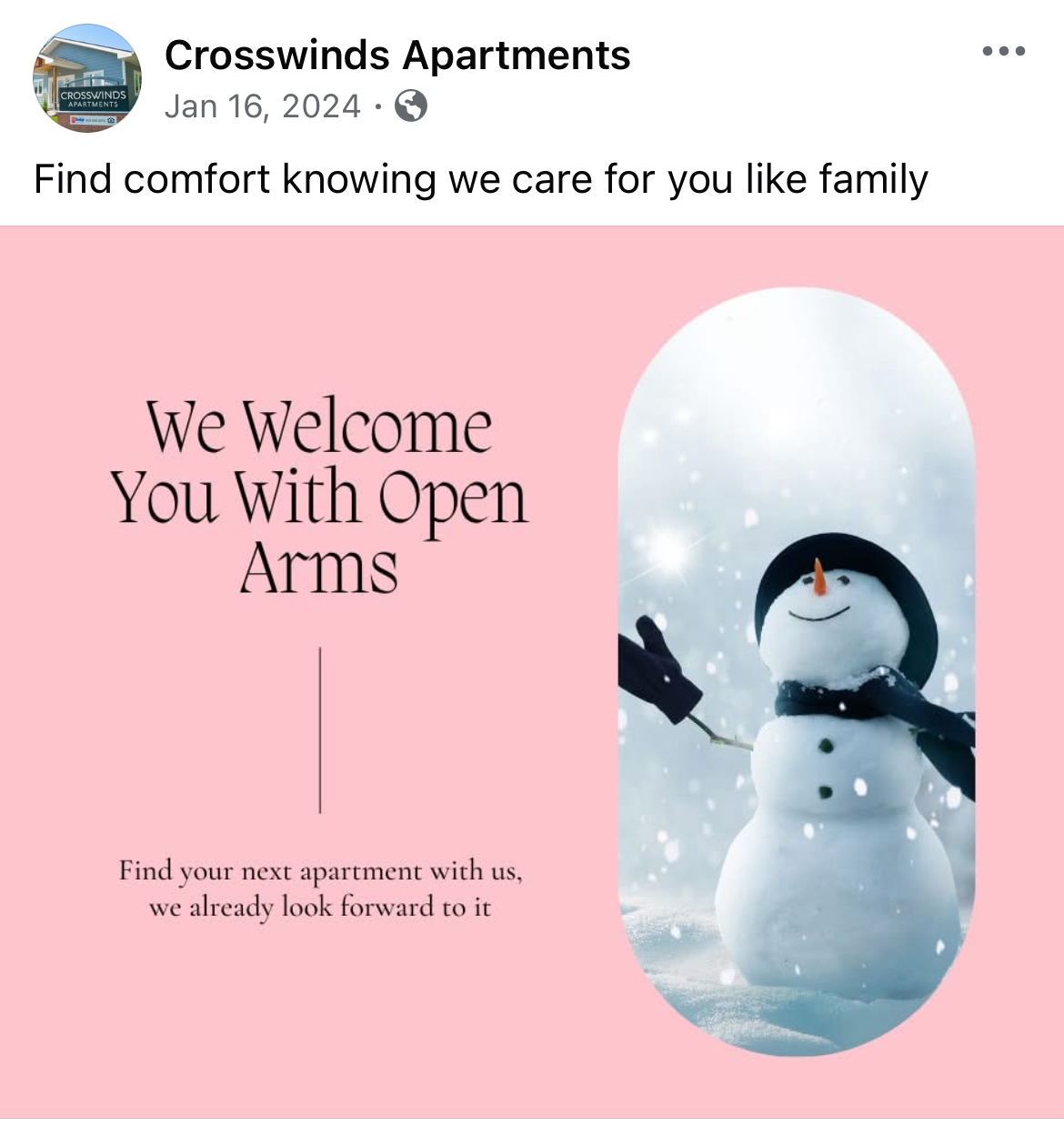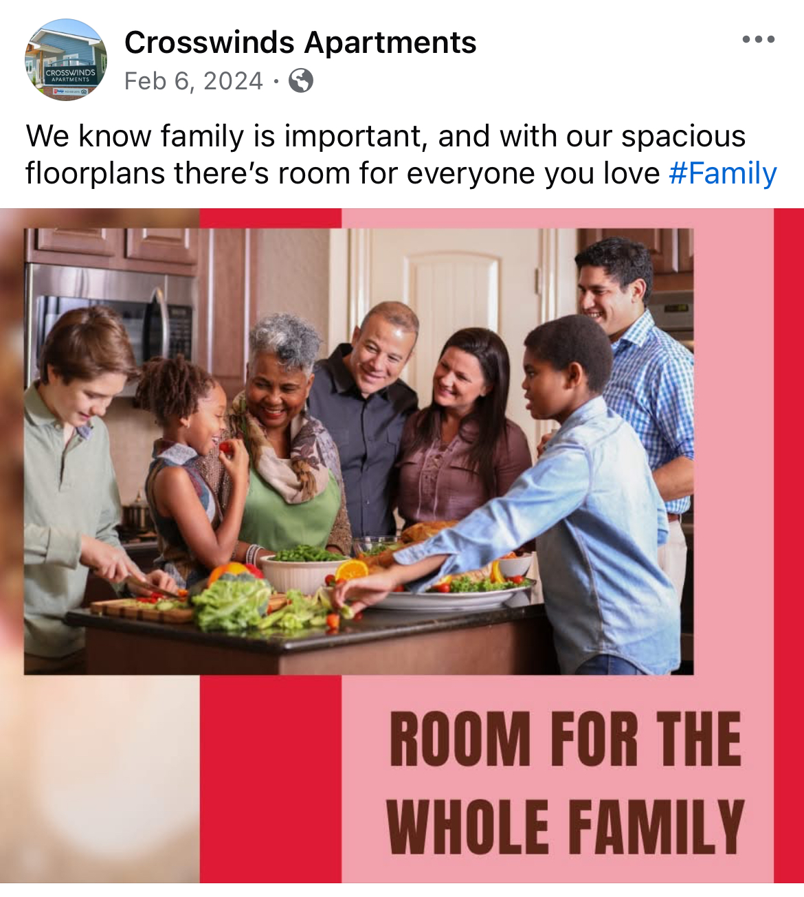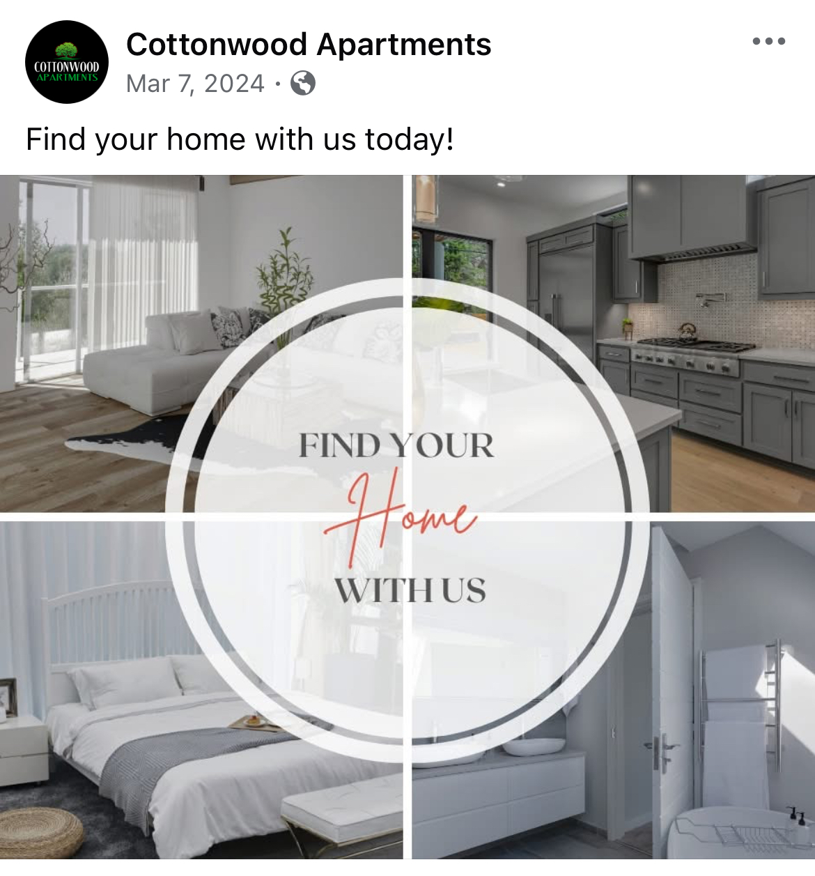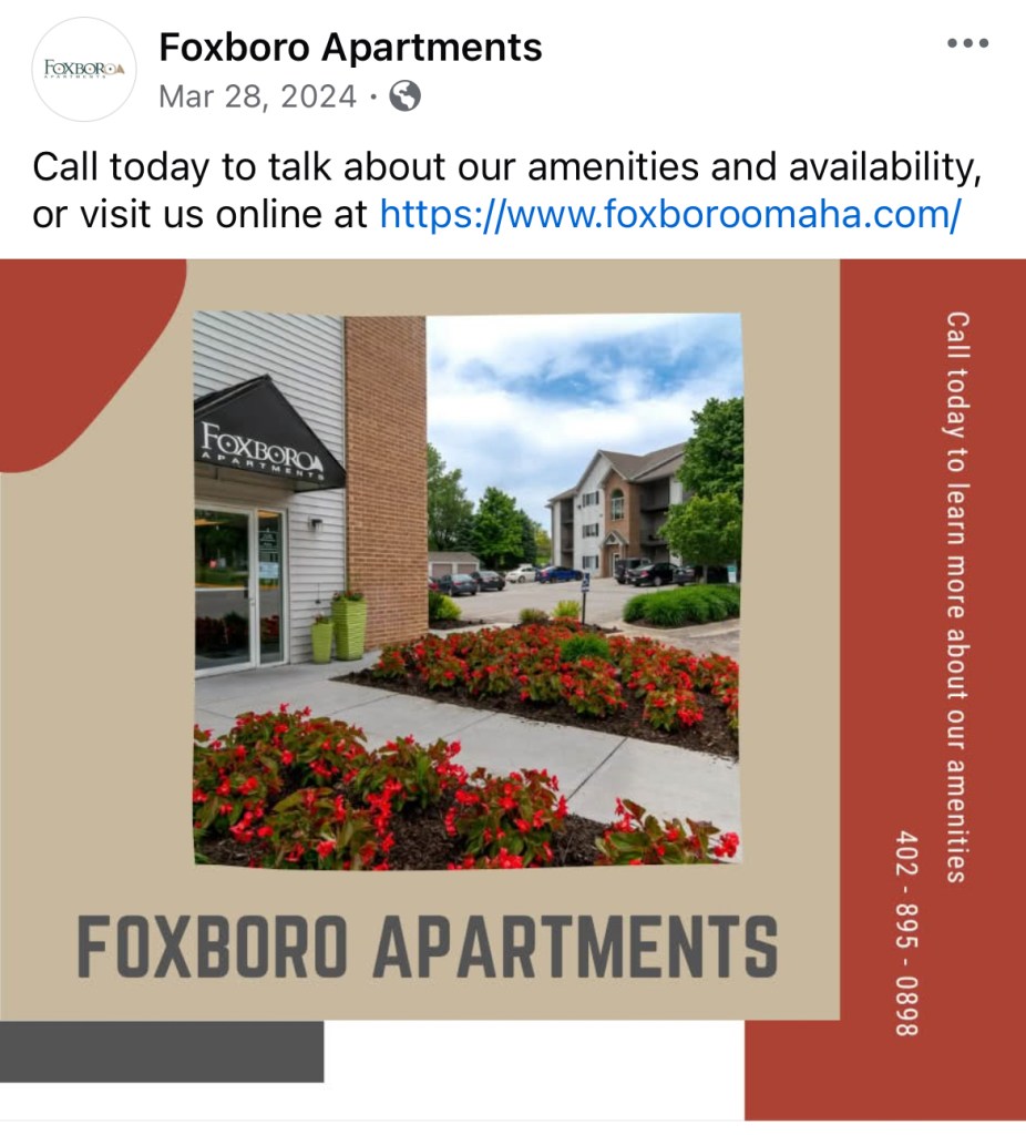 This company managed 30+ different apartment communities that I helped market online. On the main company page we would highlight different properties for a variety of reason such as a new build or just reminding followers where on our website they can see availability for all of our units.